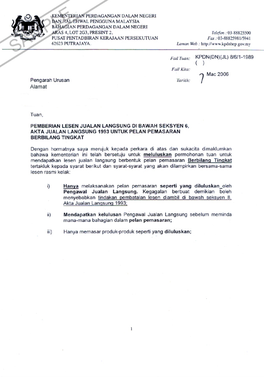 To-date, there are a total of 582 companies which carry a valid Direct Selling License in Malaysia. However, there are other operators who do not carry a valid license. In a report from Ministry of Domestic Trade and Consumer Affairs Malaysia, pyramid selling is an issue of concern because the promoters of pyramid and similar schemes often attempt to disguise themselves as a legitimate direct selling business.